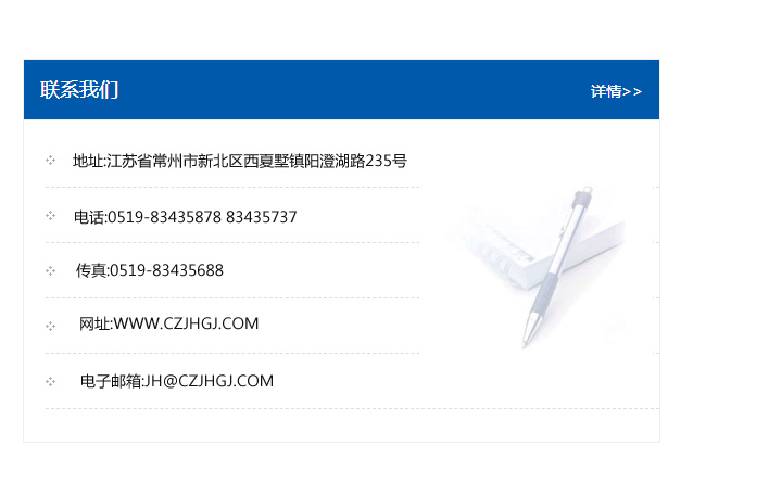 地址:常州市新北區友邦商務大廈1幢16、17層  電話:0519-85101652  傳真:0519-85112595  郵編:213022  網址:www.cz-jiayue_cn.3quwan.com  郵箱:xiajifengaa@163.com